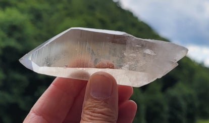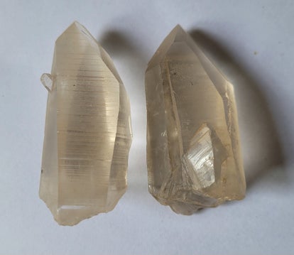 Ruwe lichte rookkwarts kristalle, in Laserkwarts vorm met zijstreepjes. Zg. Lemurians.