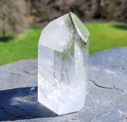 Geslepen toren Bergkristal, Lodolietkwarts ,Chloriet Fantomen. 269 gr. 8,5 cm Lodolite quarz Shamanquarz