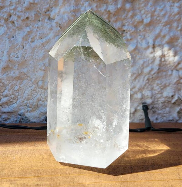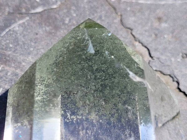 Prachtige heldere geslepen toren Bergkristal met Lodoliet, Chloriet fantomen. Kleine streepjes onder elkaar in groen en beetje rood.
