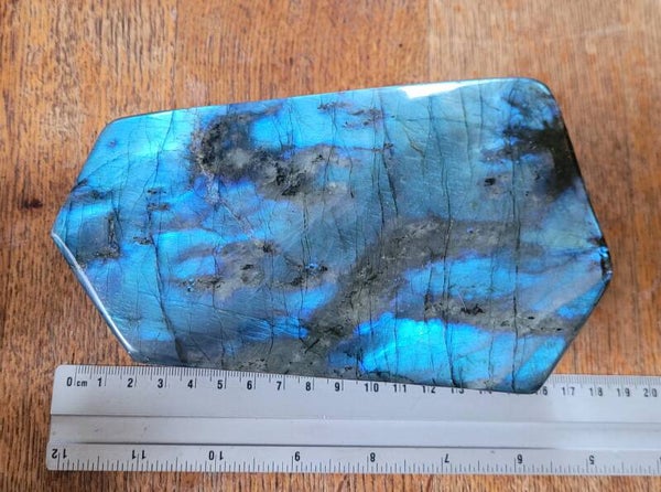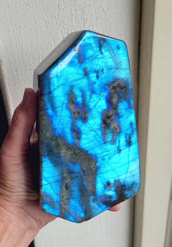 Prachtige sculptuur Labradoriet met erg mooie intens blauwe flash. Madagaskar. Super kwaliteit.