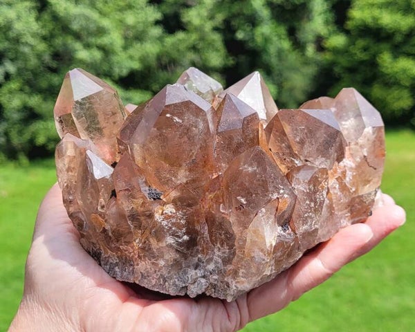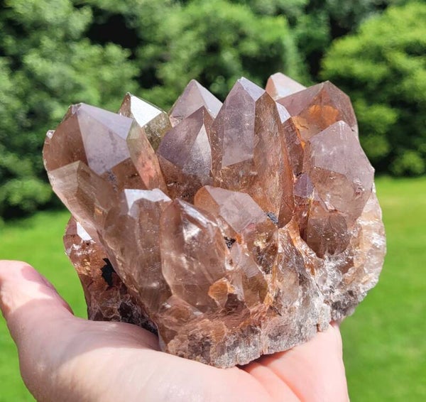 Cluster Smokey Quartz wit large crystals an Hematite, what makes it Reddisch. Brasil.