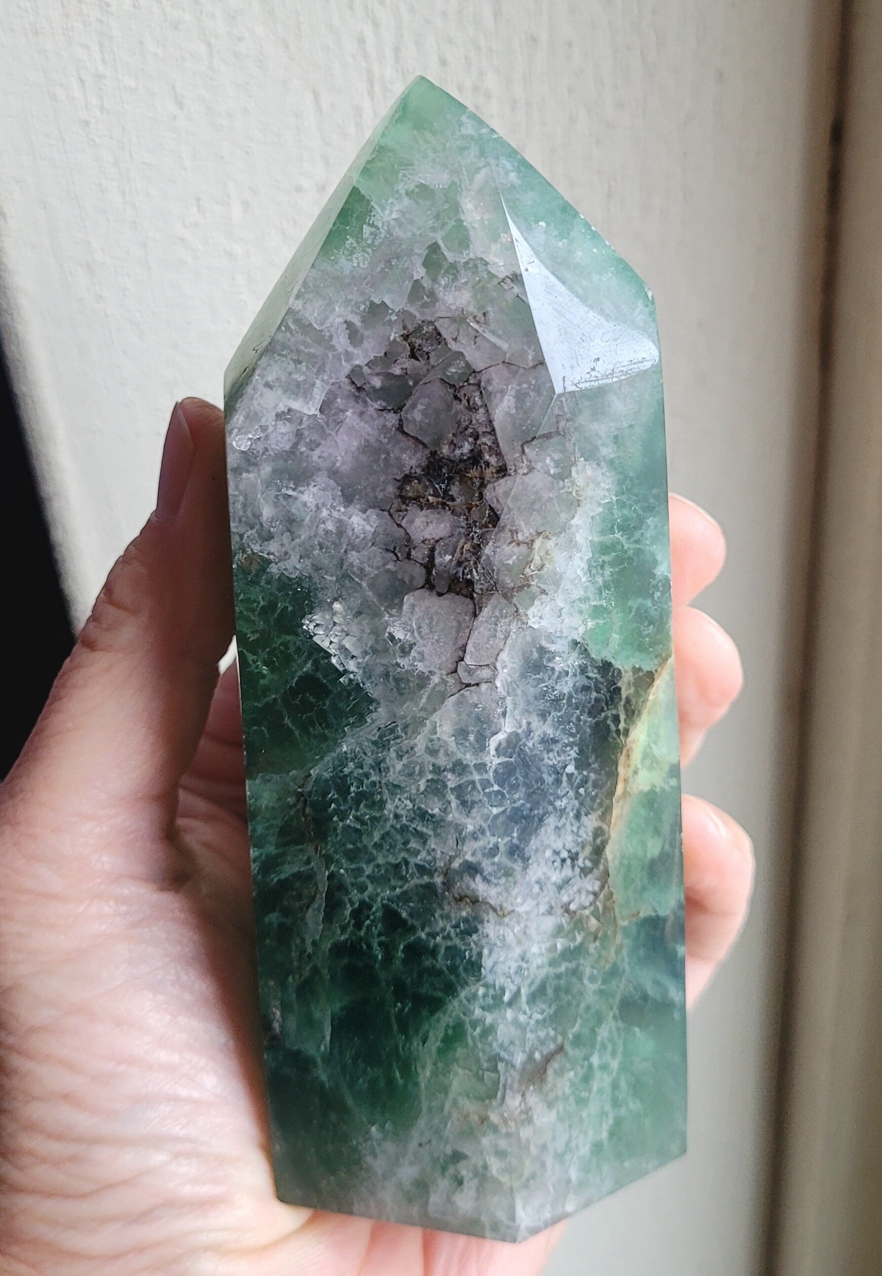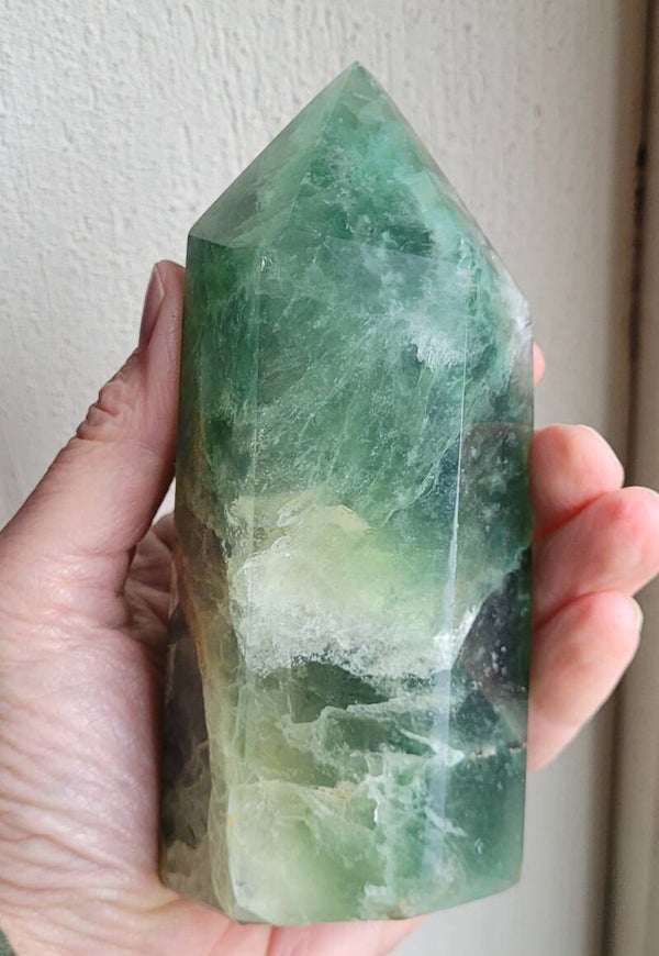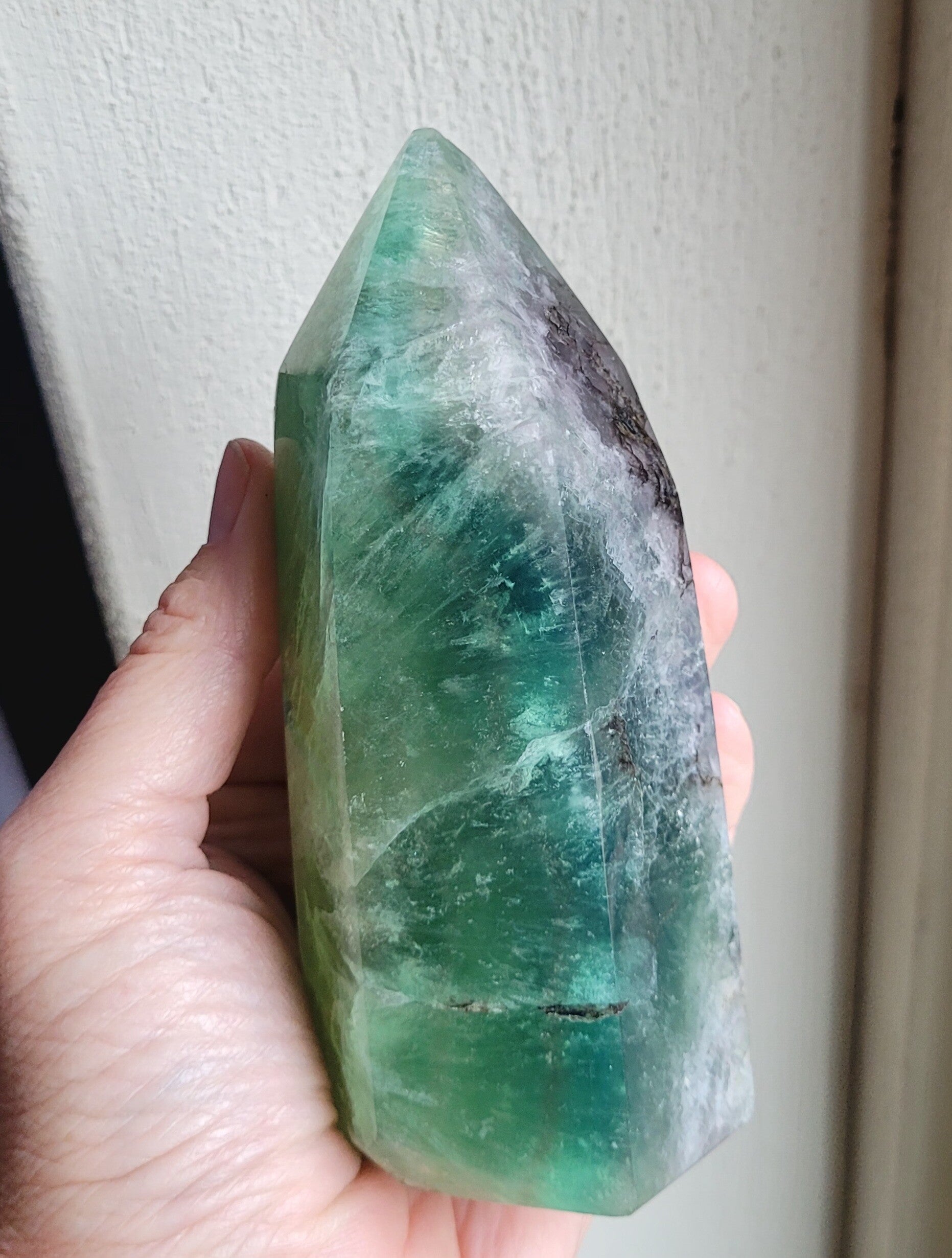 Geslepen toren Groene Fluoriet uit Madagaskar.