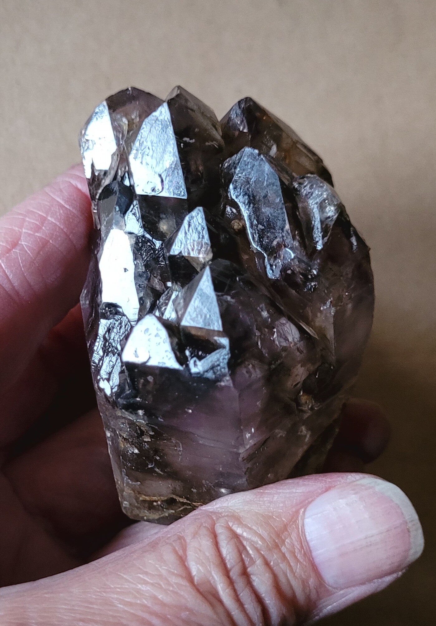 Erg mooi groot donker kristal met Rookkwarts en Amethist. Uit KwaZulu Natal. Zuid Afrika. Ook lampfoto's waardoor het erg mooi wordt. Net kasteeltorentjes, elestiaalkwarts groei.