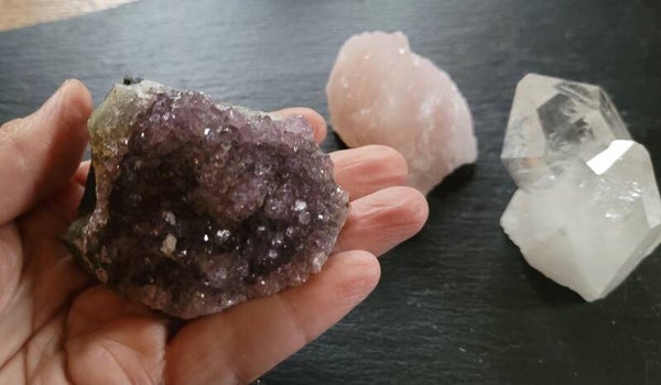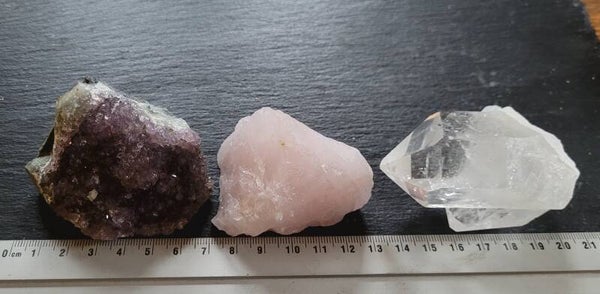 Set von 3 Roh kristalle/ steine. GOldene Dreieck. Bergkristall von Diamantina, Rosenquarz von Madagaskar und Amethyst von Uruguay.