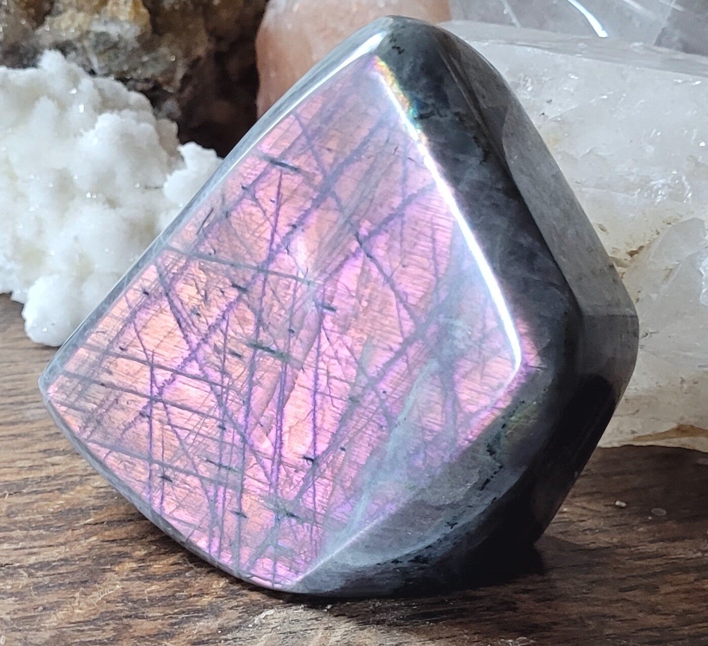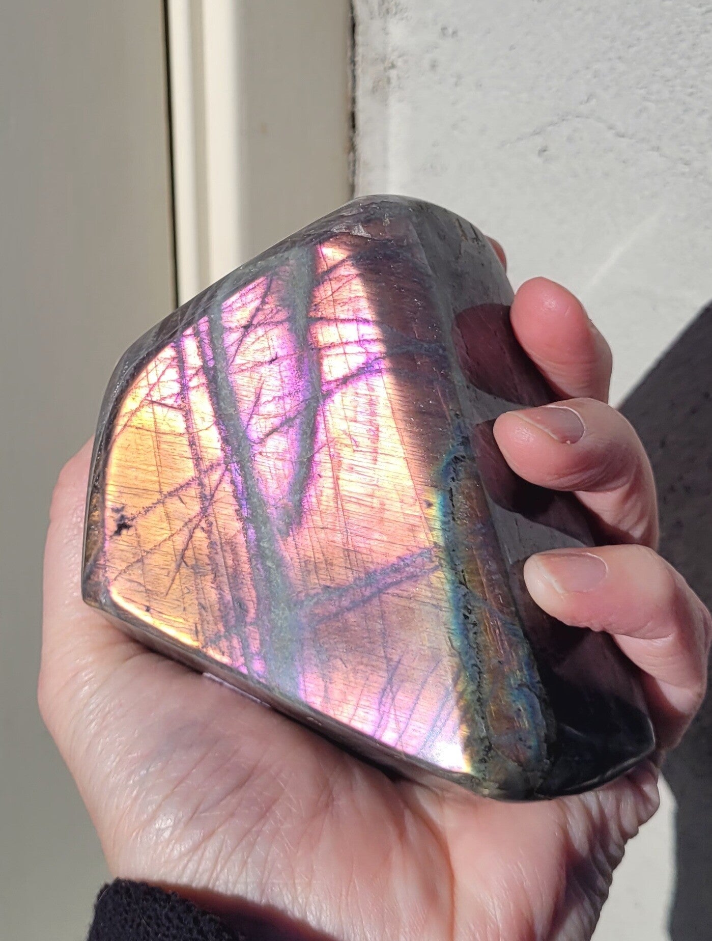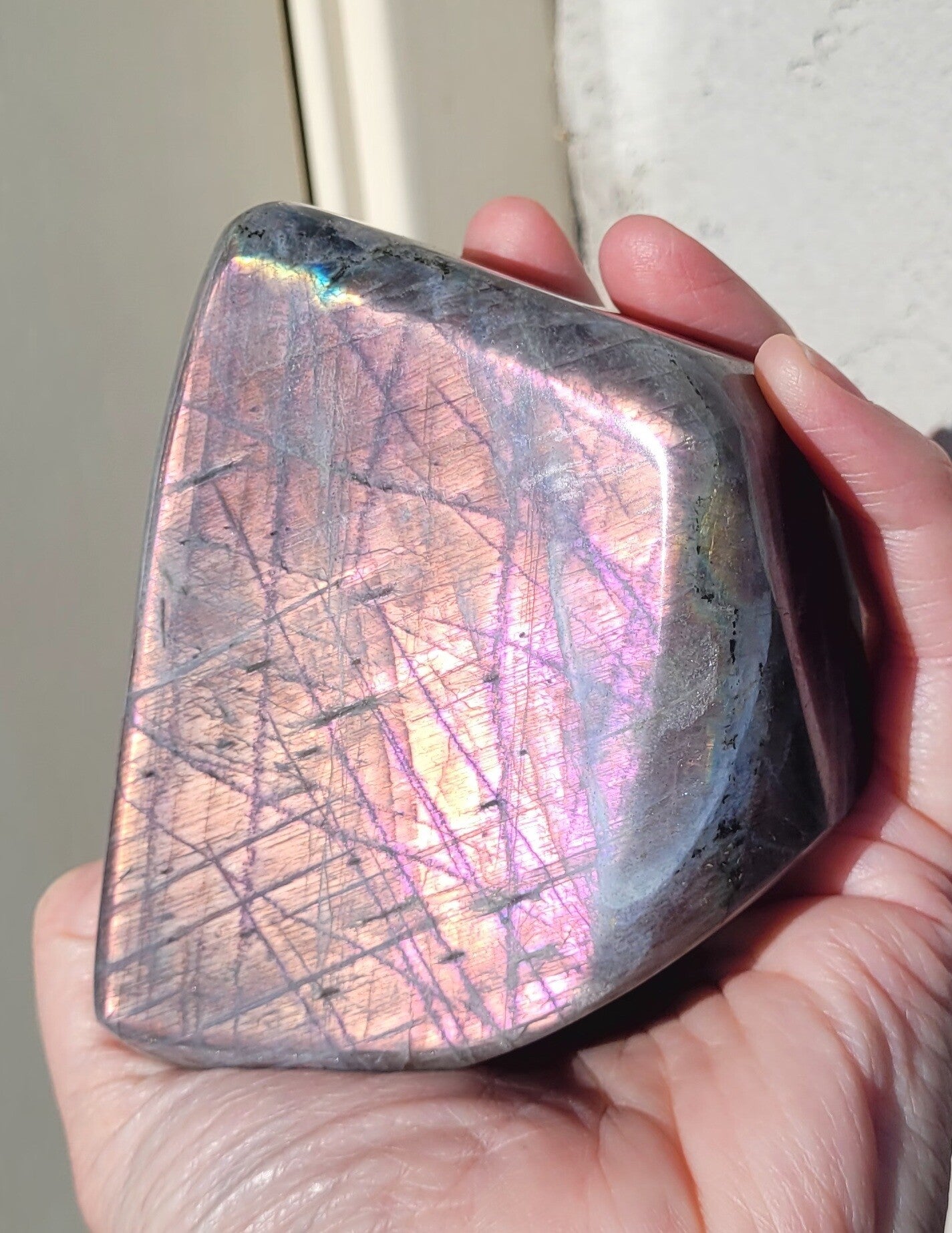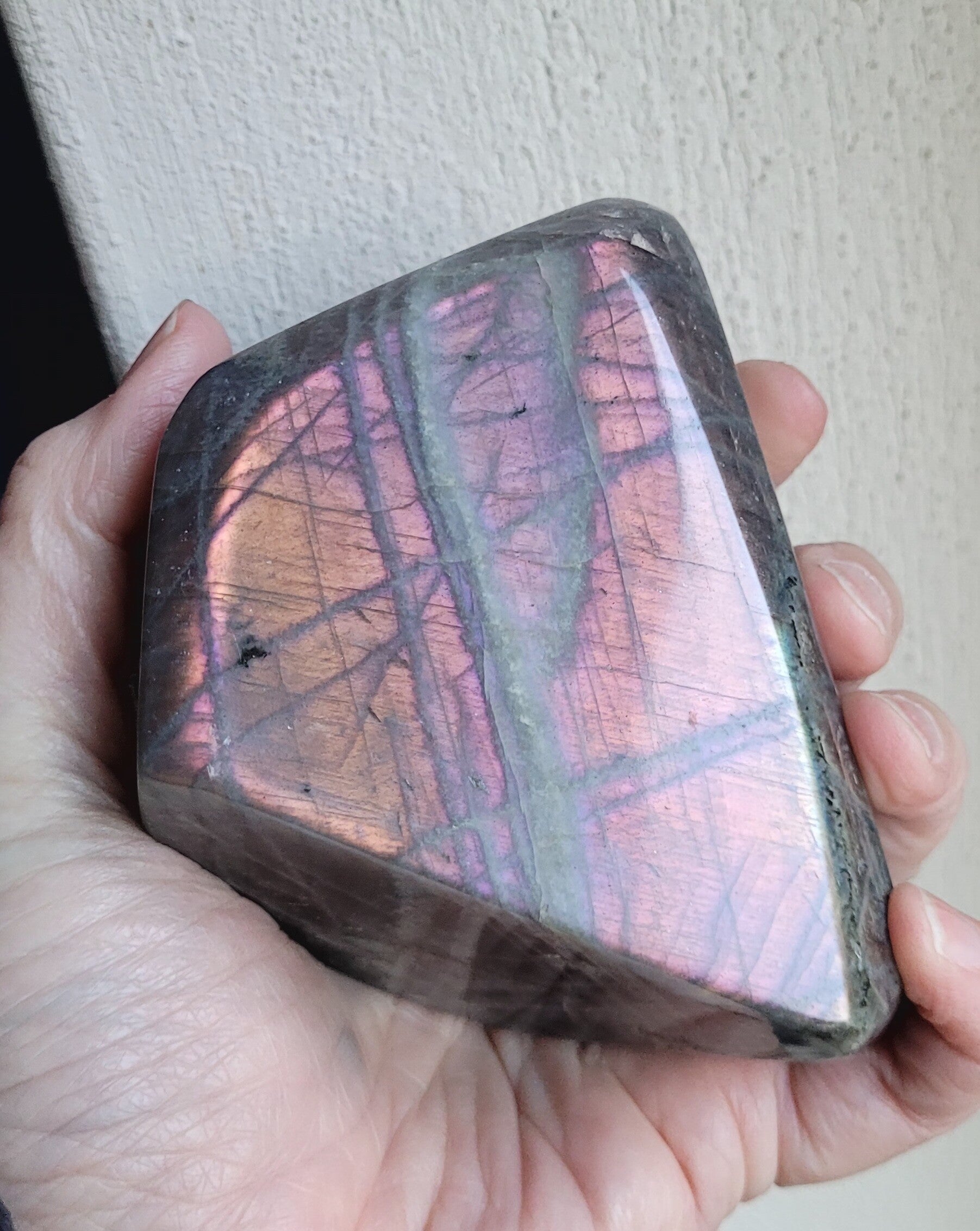 Schöne skulptur Pink Labradorit, Mermaid Labradorite. Pink, lila, Rosa, Orange farbenspiel.