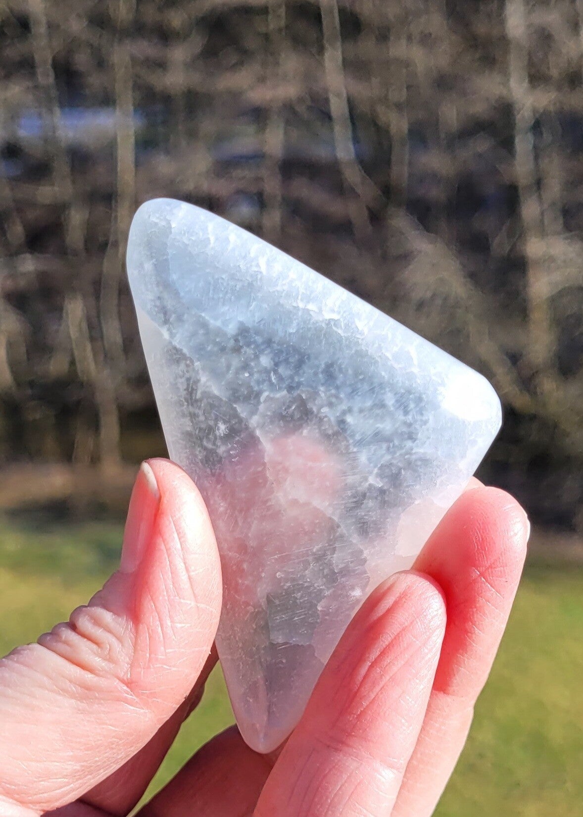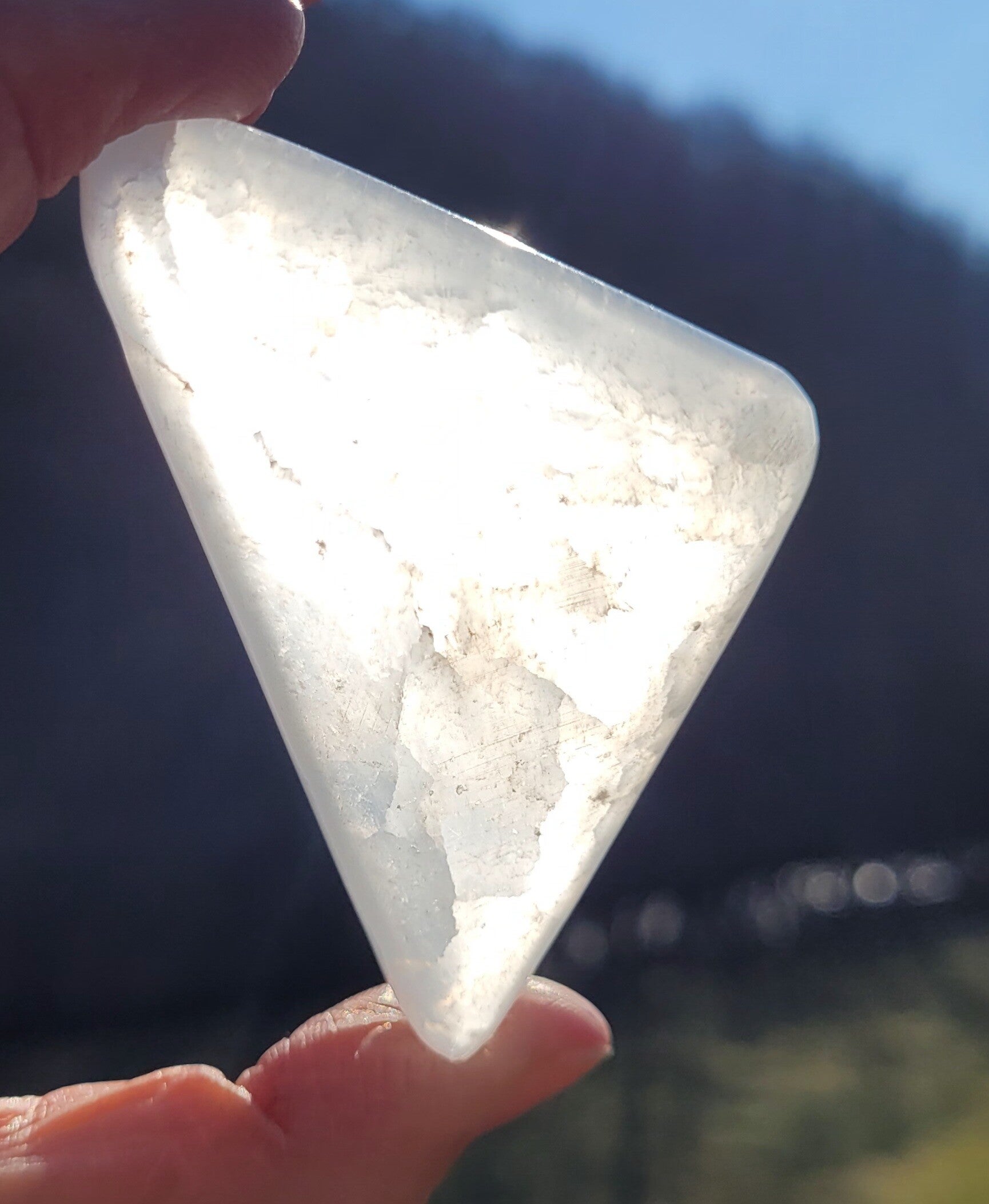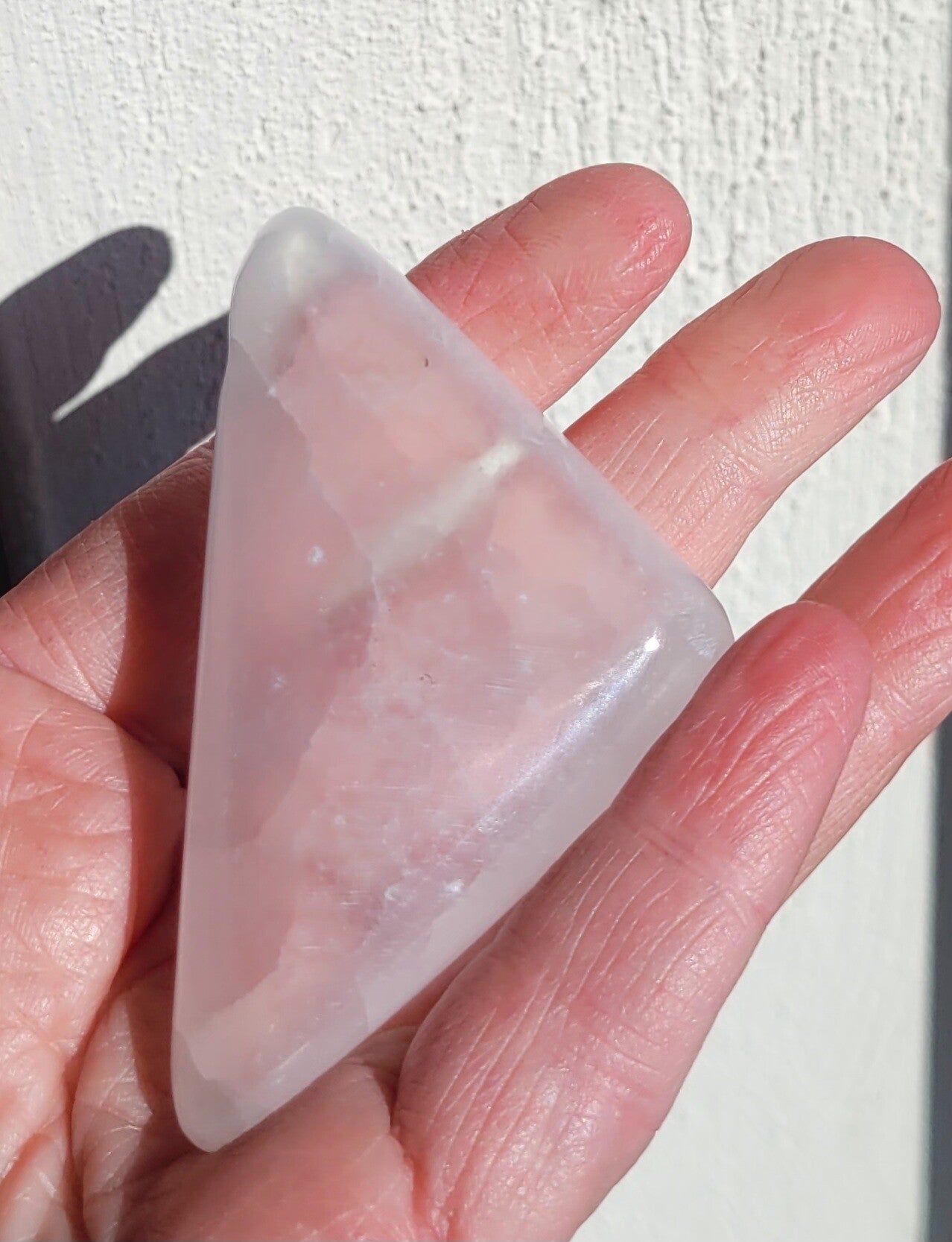 Triangle polished stone Selenite/satin spar, clear. Very Soft touch. Also calledTV stone.