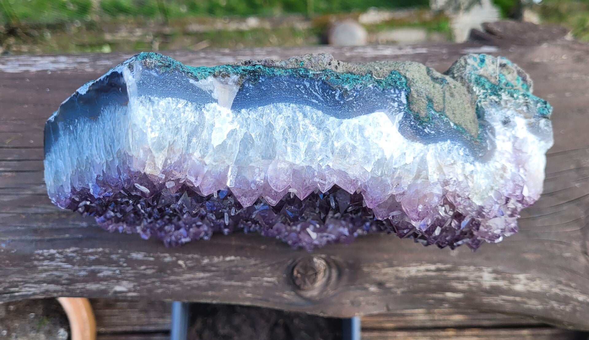 Mooie grote zelfstaande ruwe Amethist met rijstkorrel calcietkristallen. Brazilië.