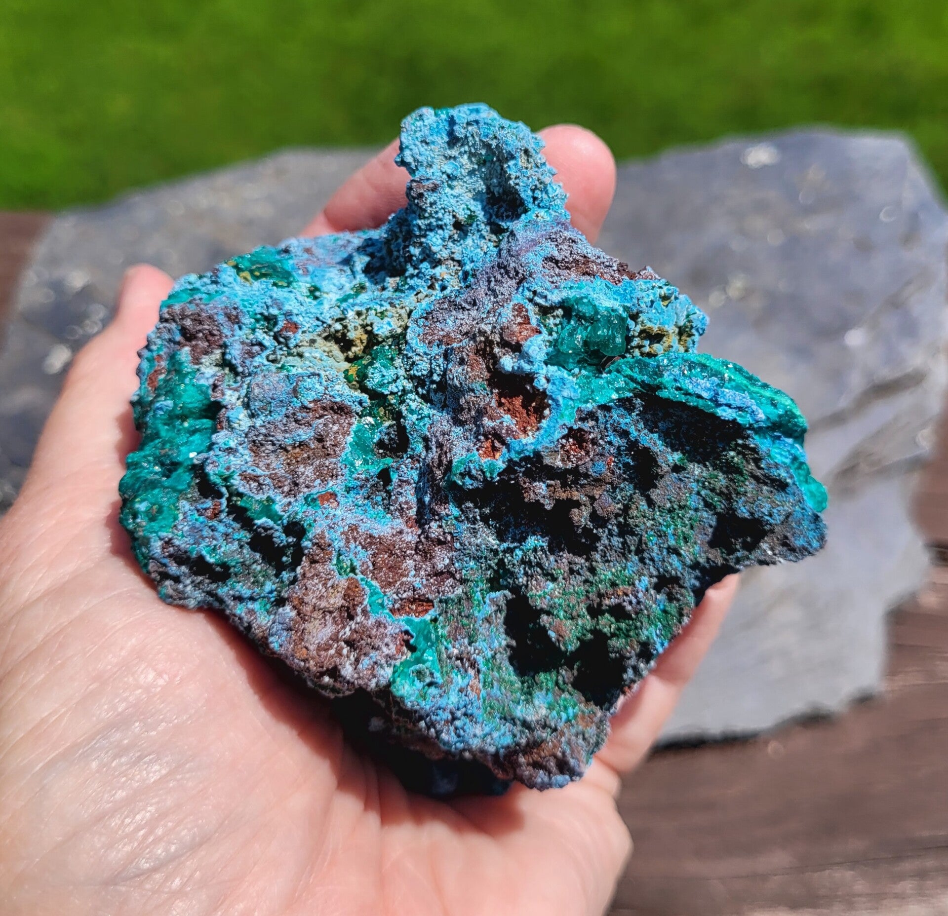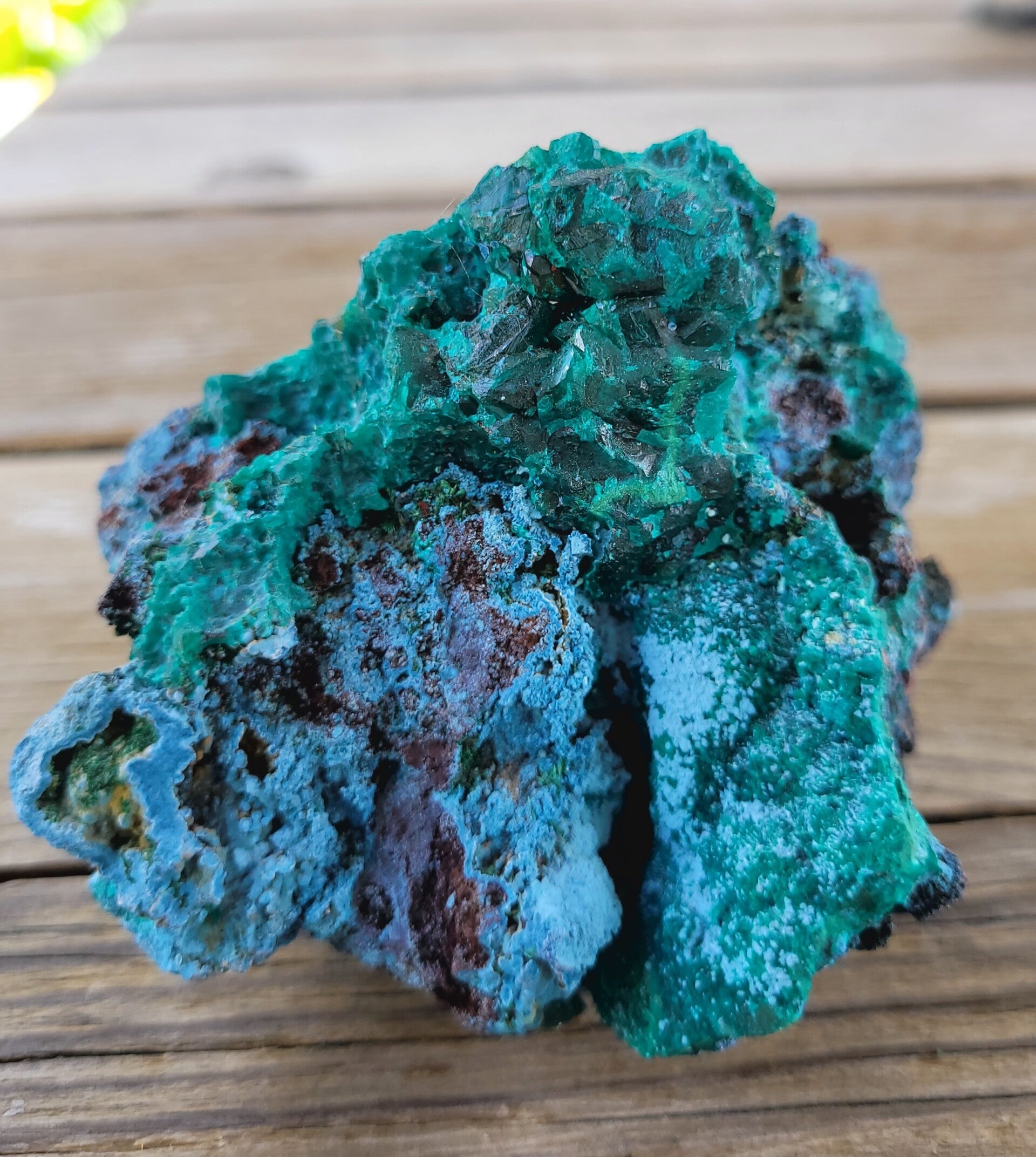 Mooie ruwe brok met lichtblauwe Plancheïte bolletjes en Donkergroene Dioptaas kristallen uit Congo.