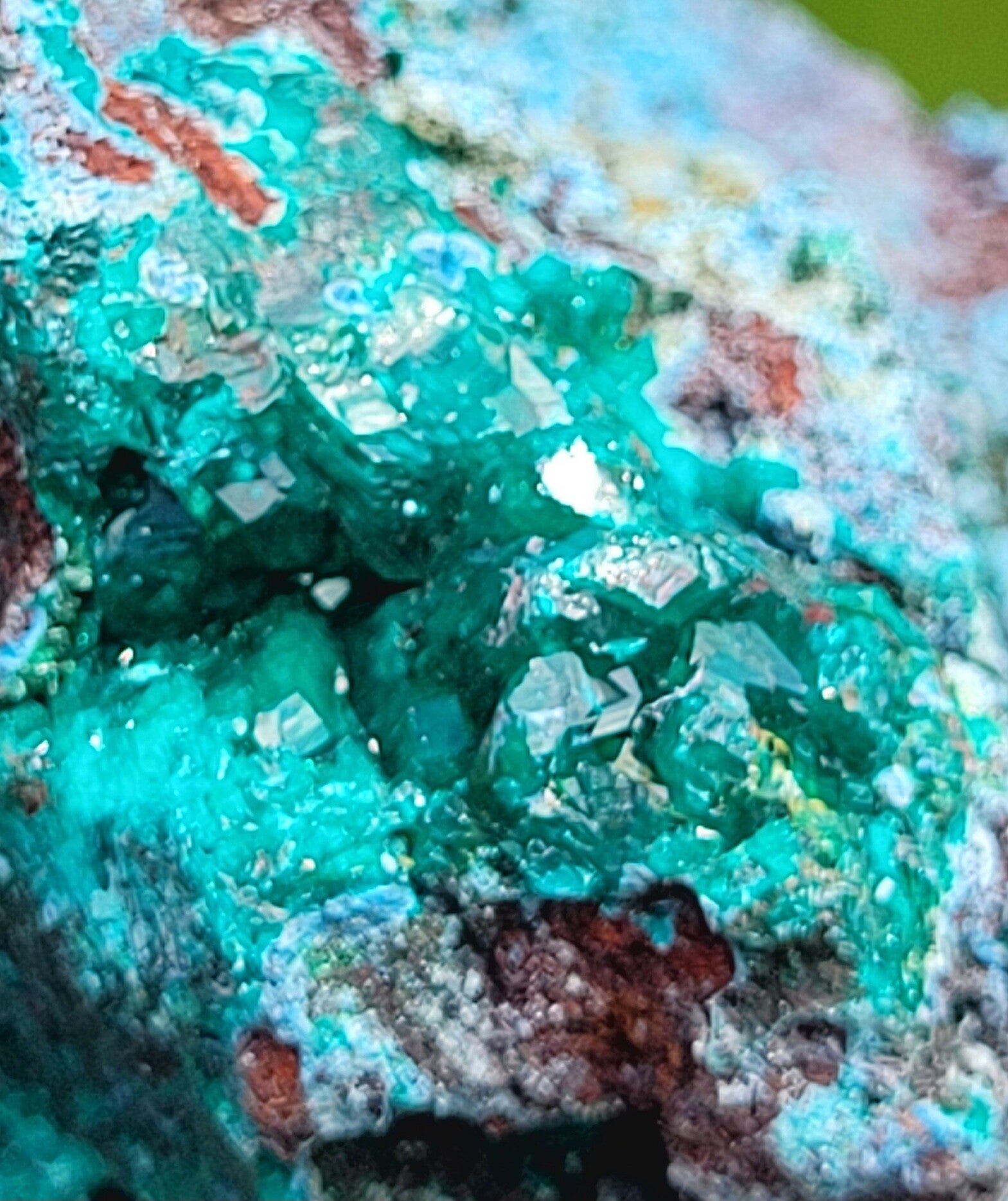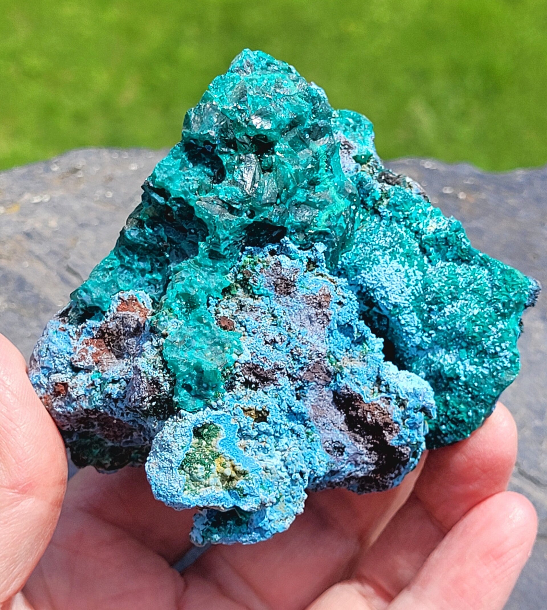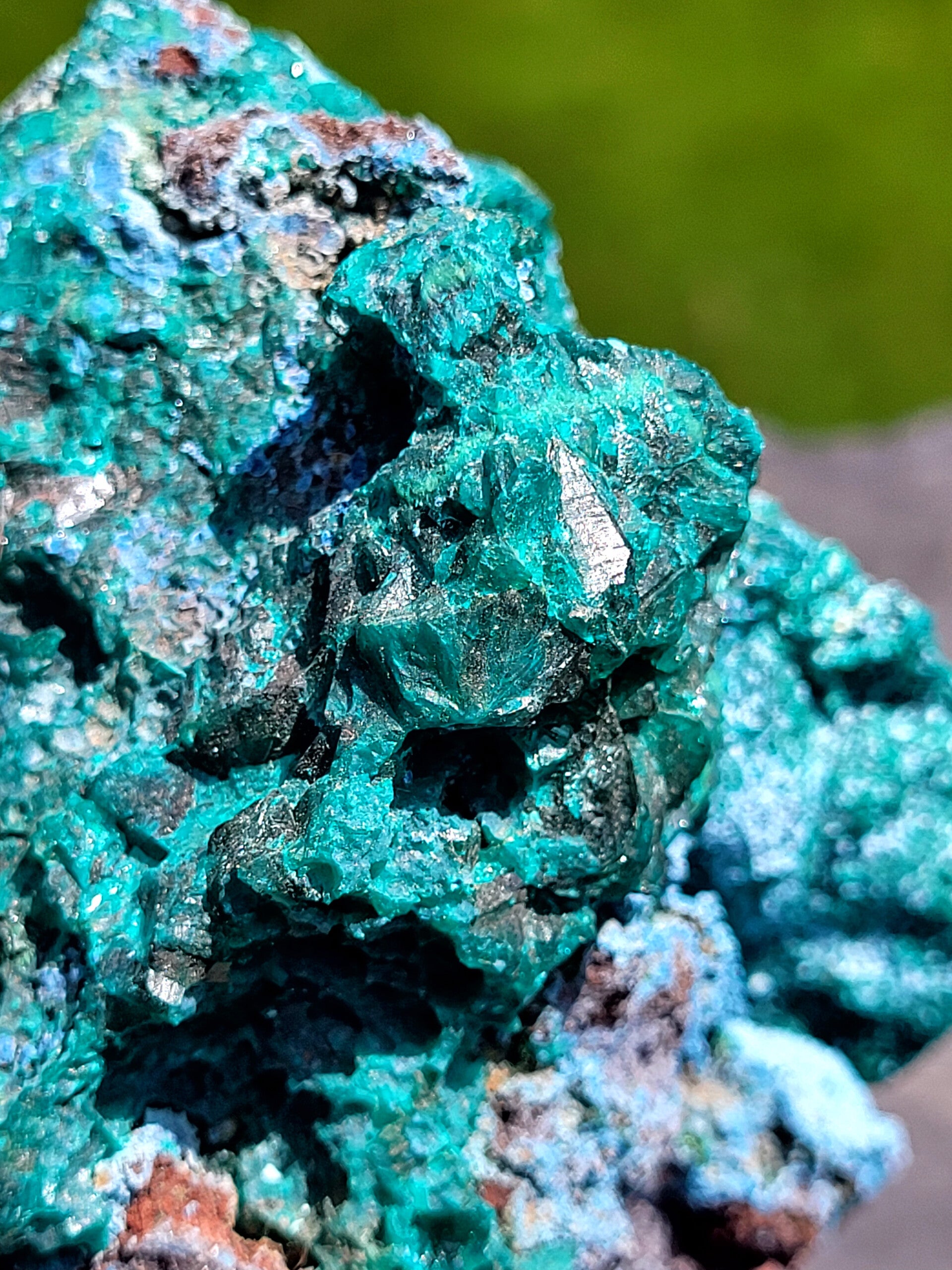 Rohes brock mit Hellblaue Plancheït Kugeln und dunkle grüne Dioptas kristalle. Kongo