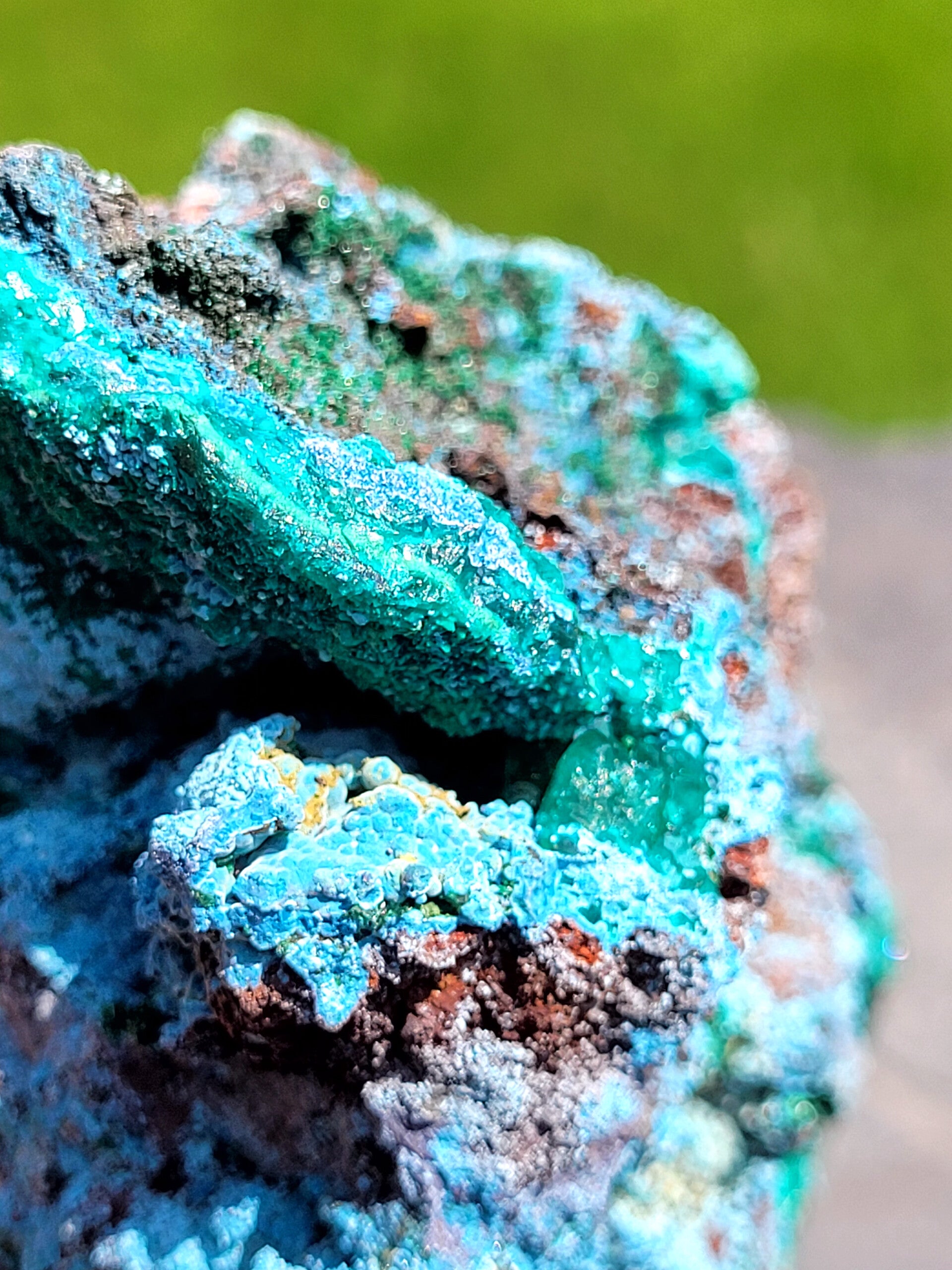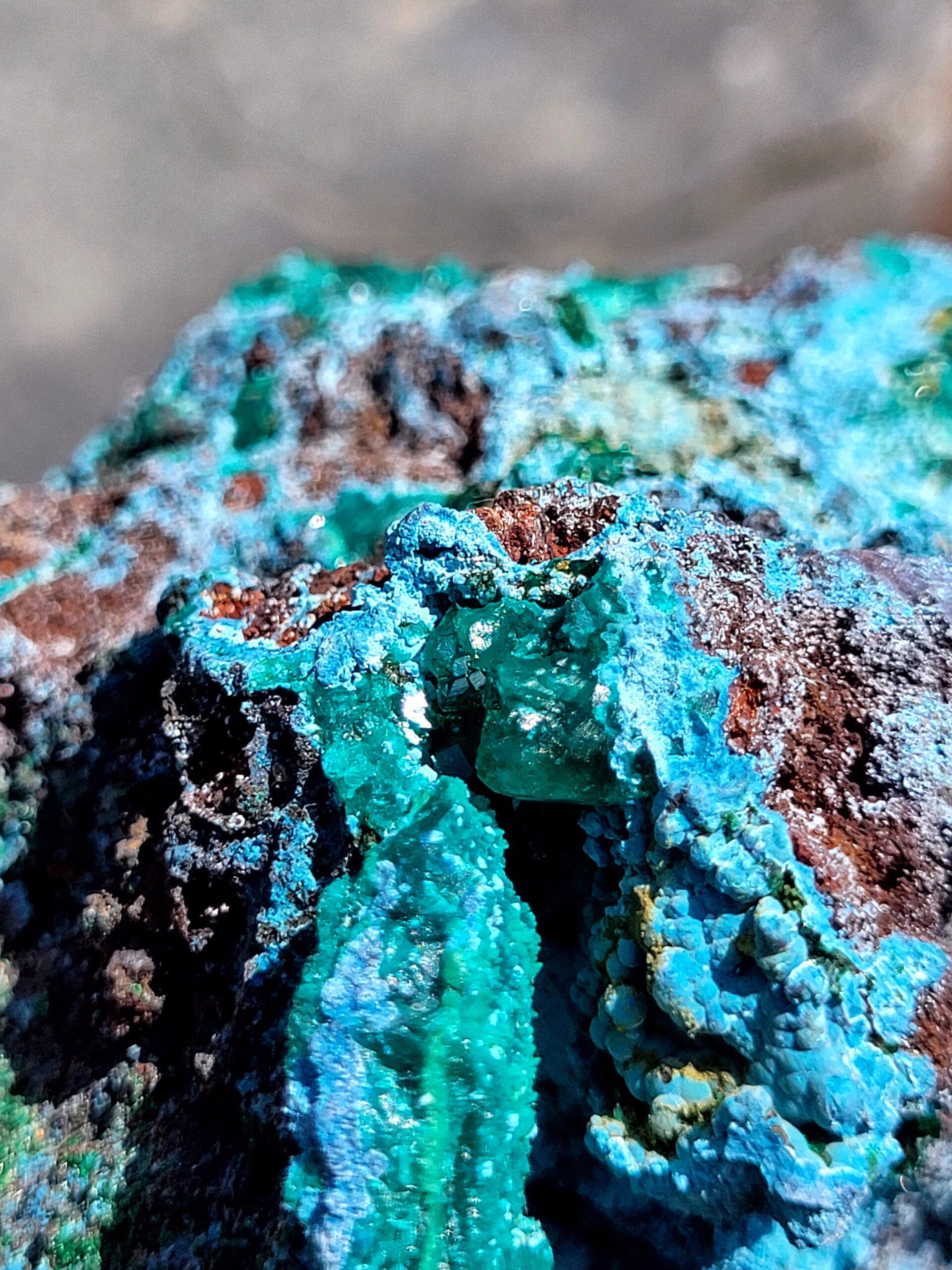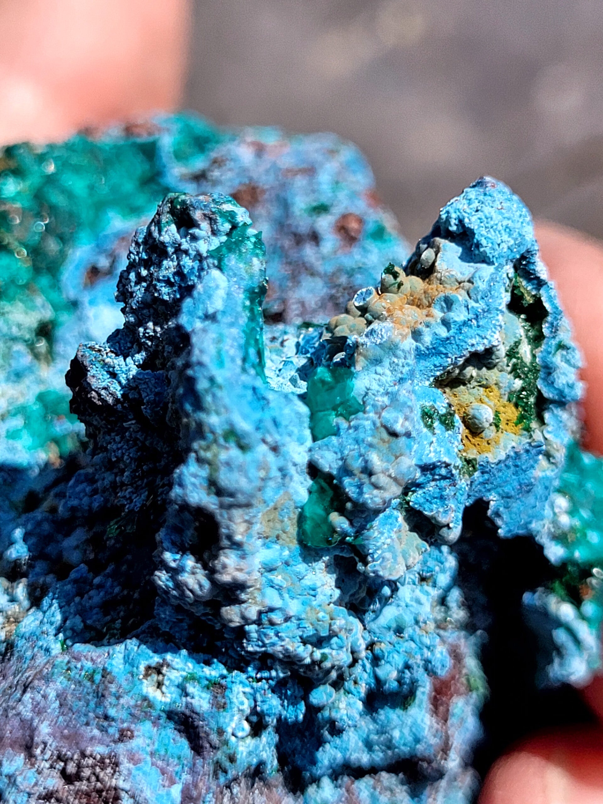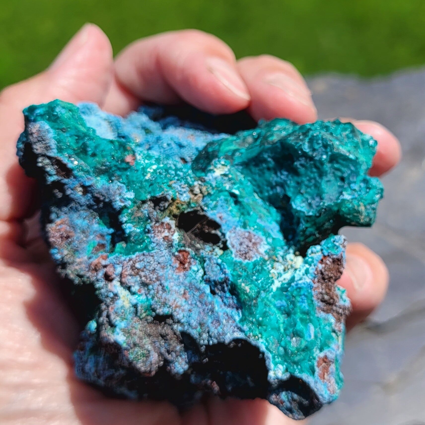 Rohes brock mit Hellblaue Plancheït Kugeln und dunkle grüne Dioptas kristalle. Kongo