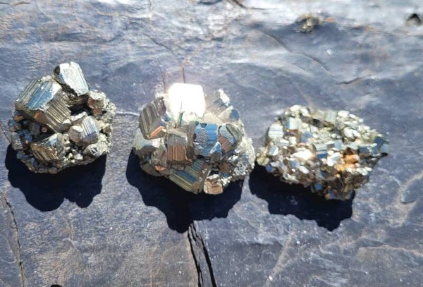 Mooie stukjes pyriet met kubuskristallen. Onderkant vlak.
