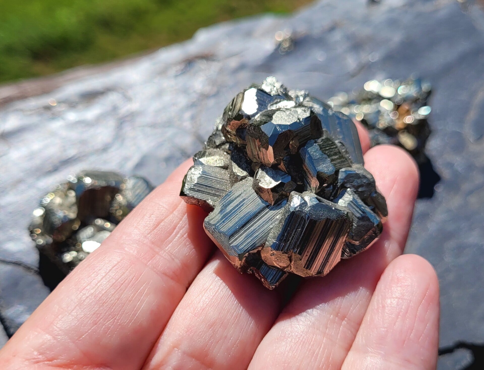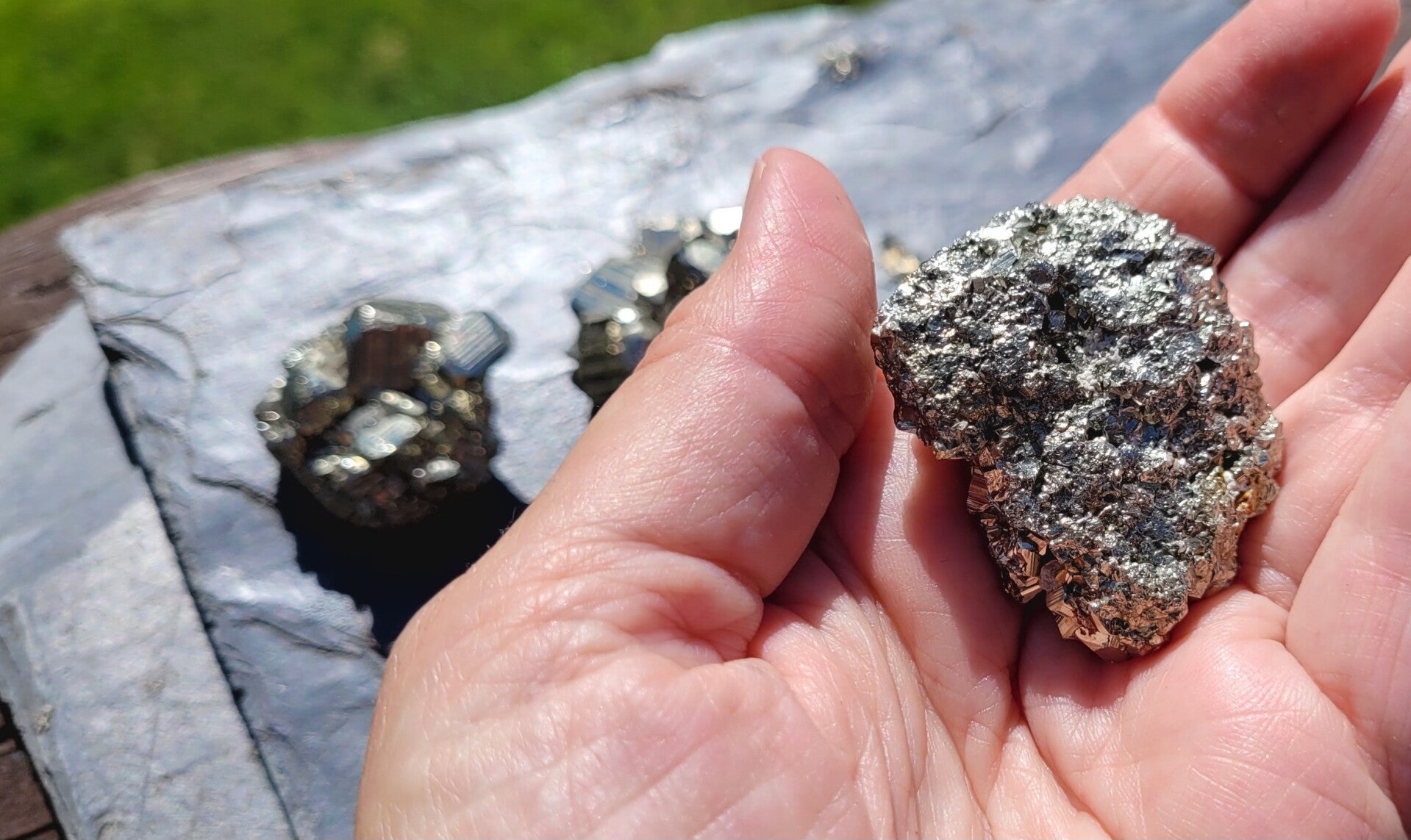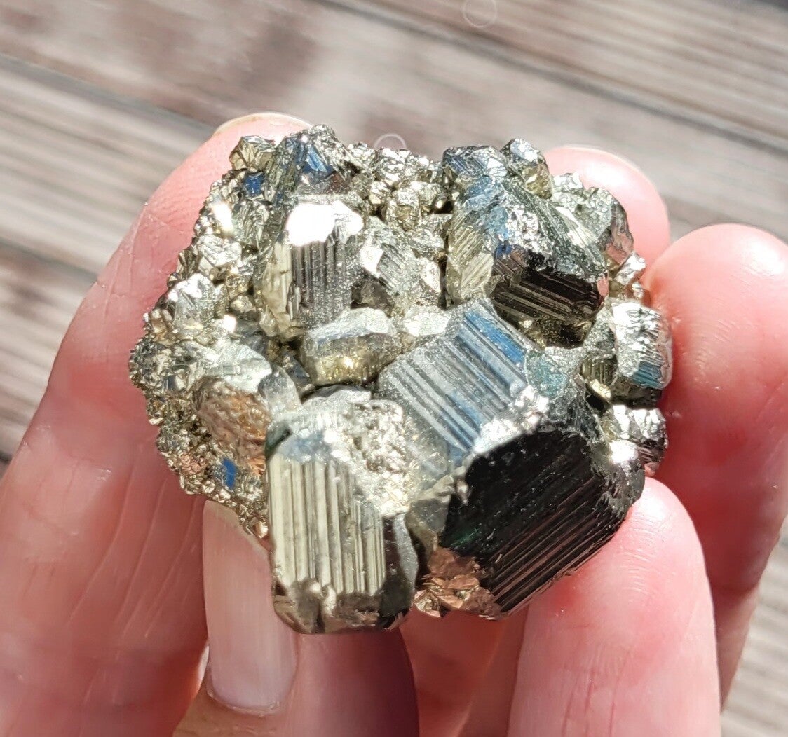 rough pieces of Pyrite with blockcrystals. Bottomside is flat.
