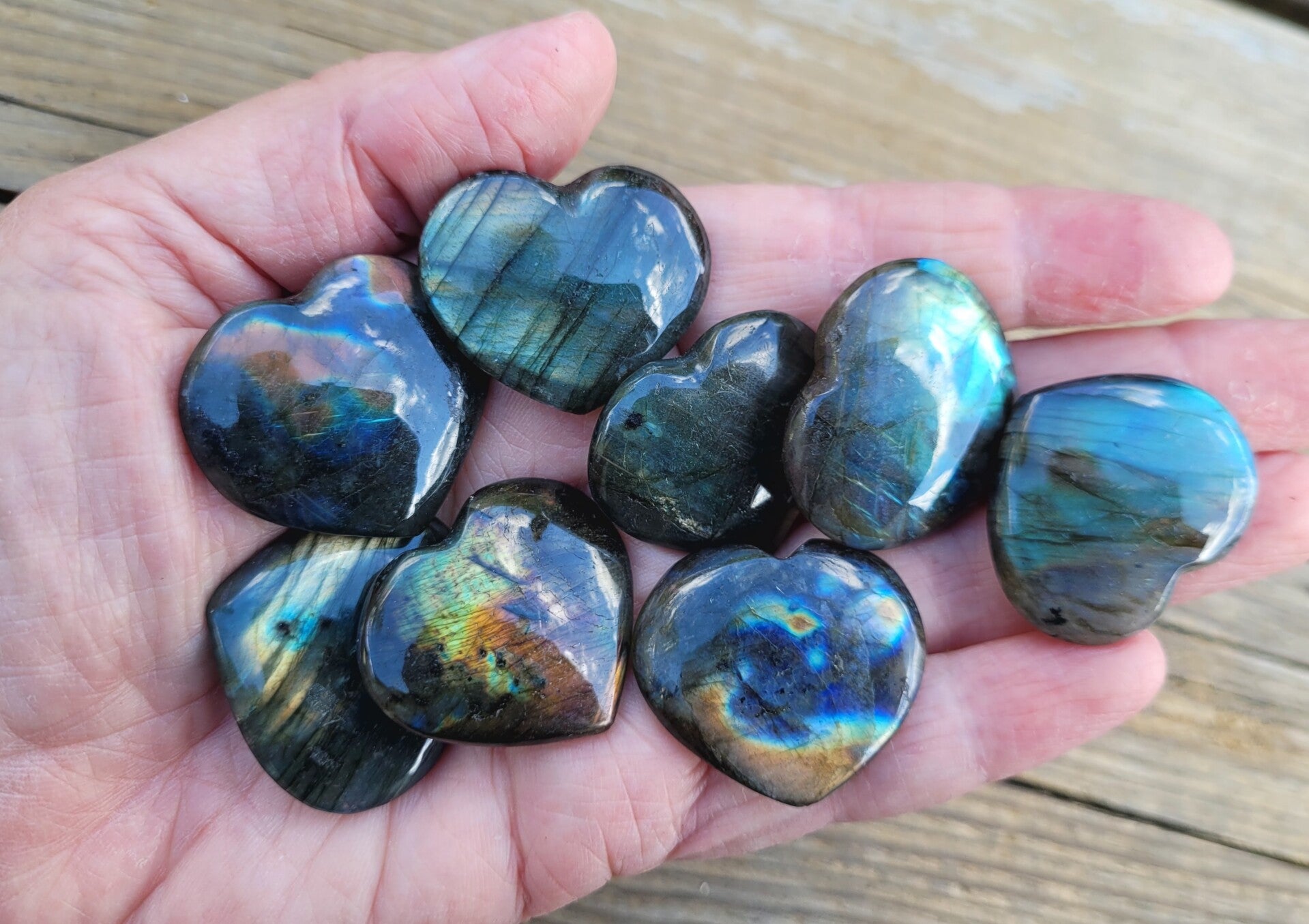 Deze 8 hartjes Labradoriet, mix kleur. Allemaal mooie flash. ( = 3,75 p.st.)