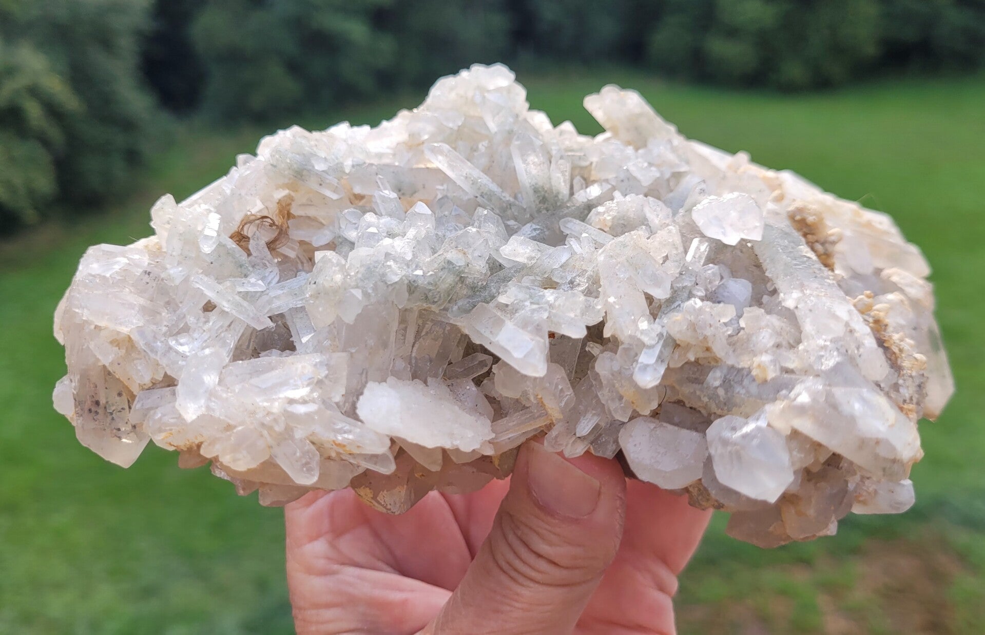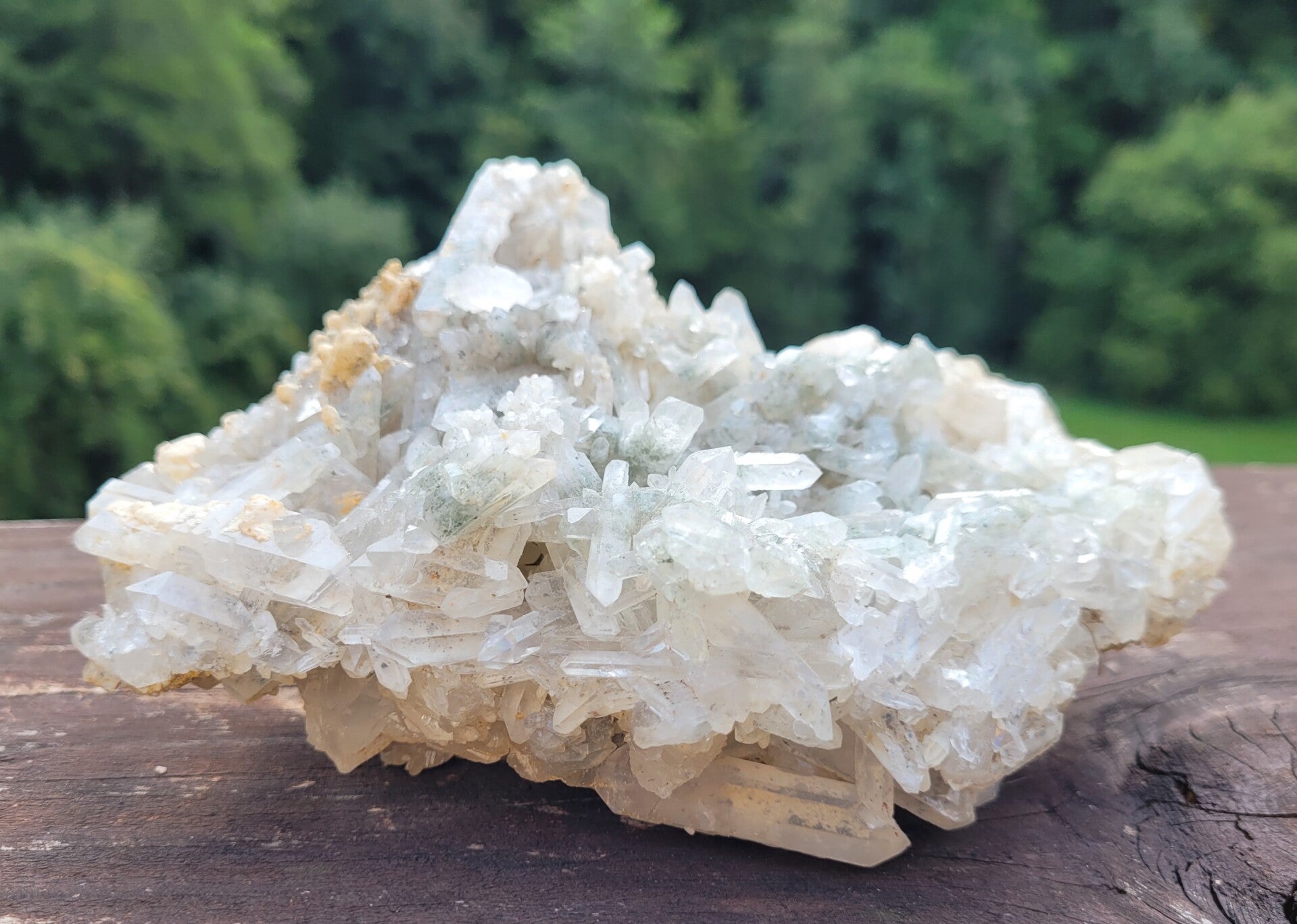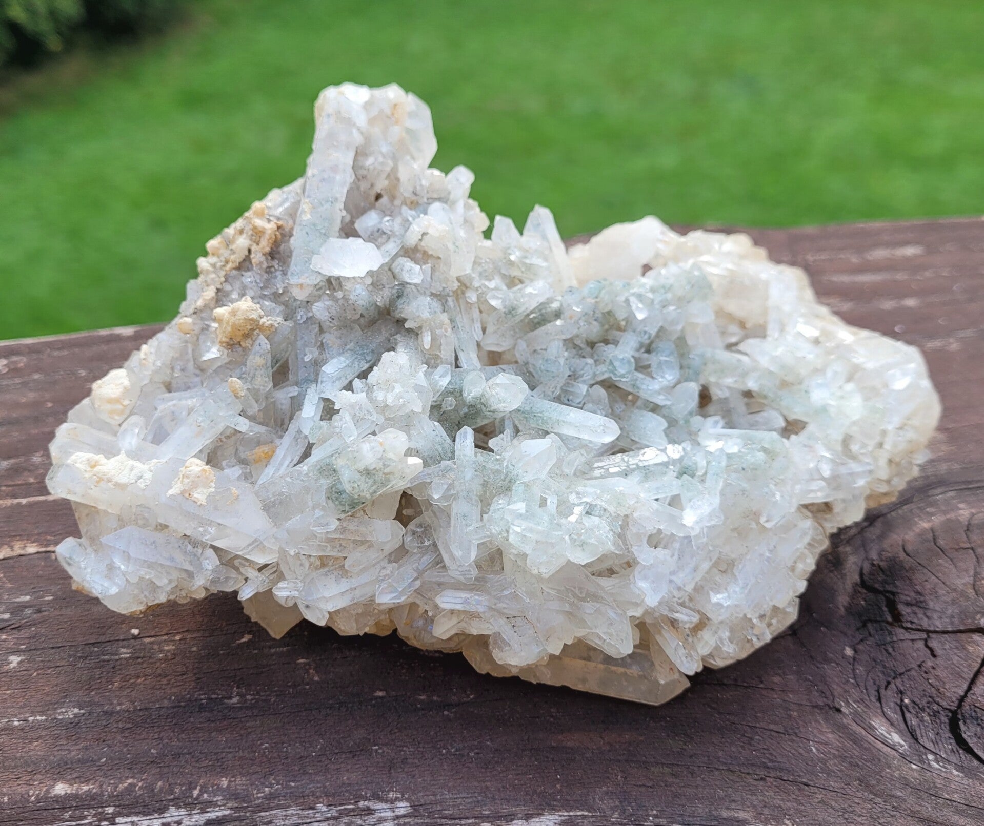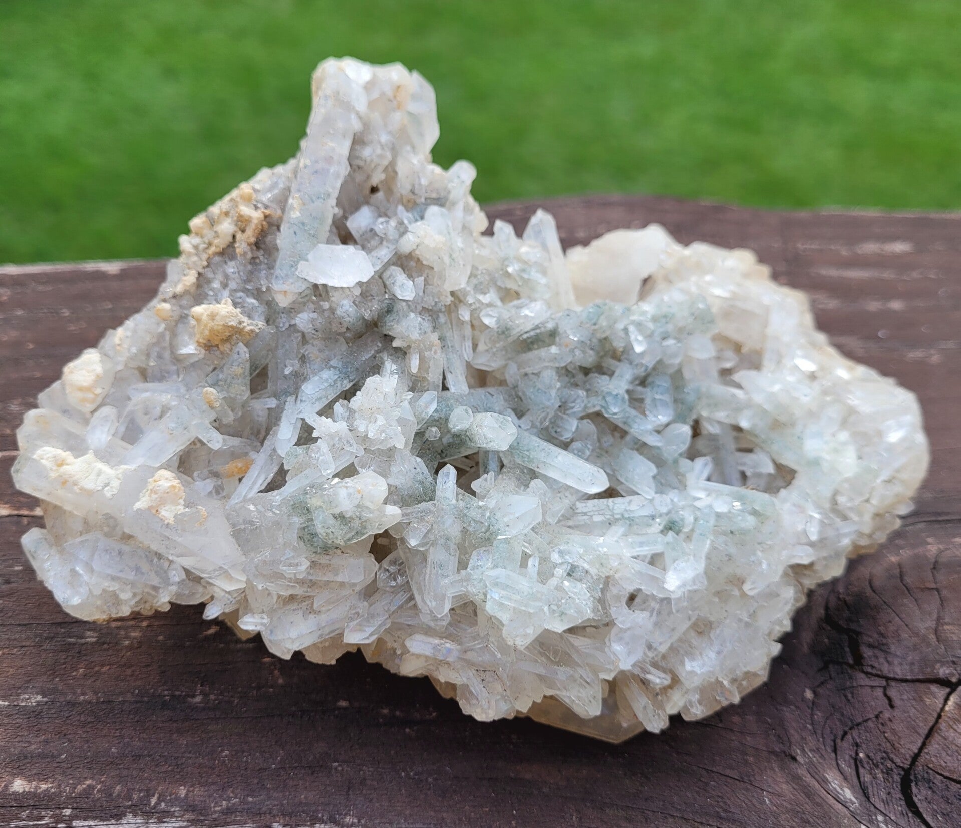 Stufe feine Bergkristall mit Chlorit, und gelb an untenseite ( limonit?) Kristalle rundum.