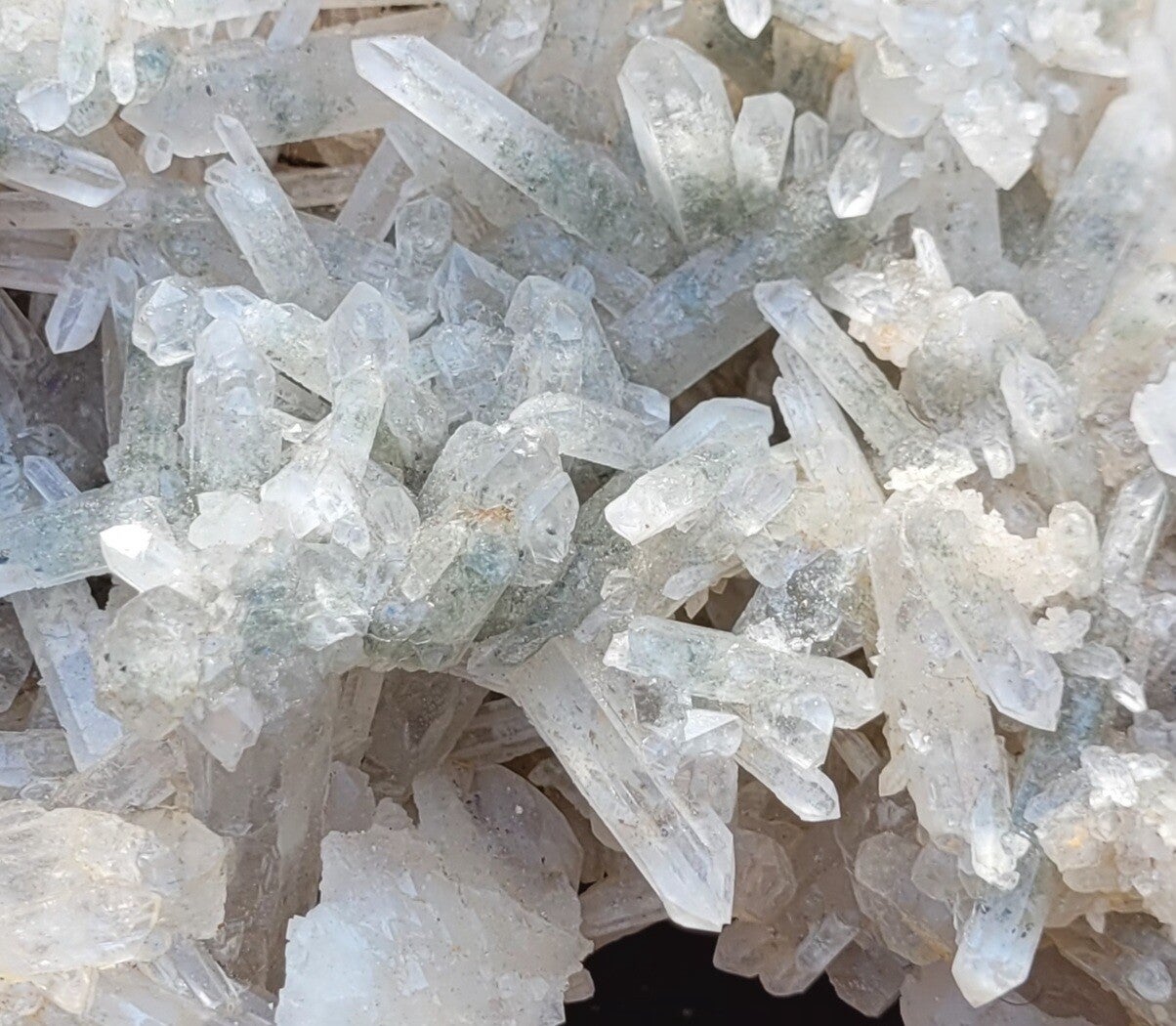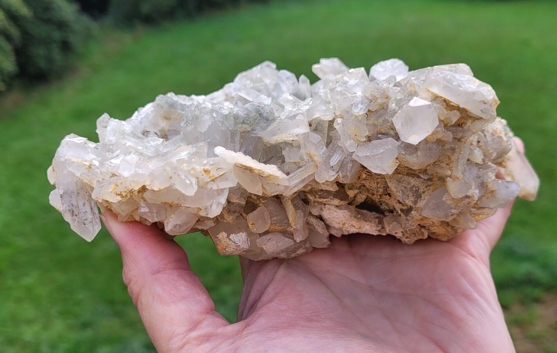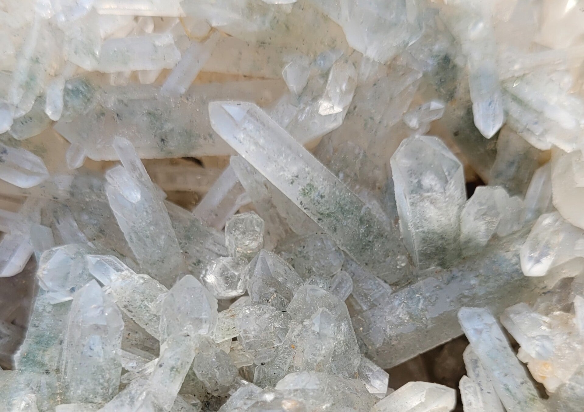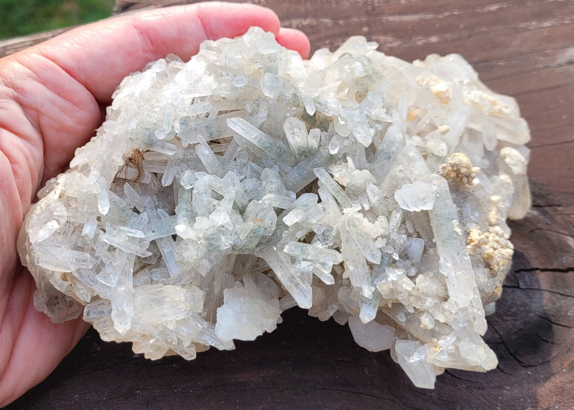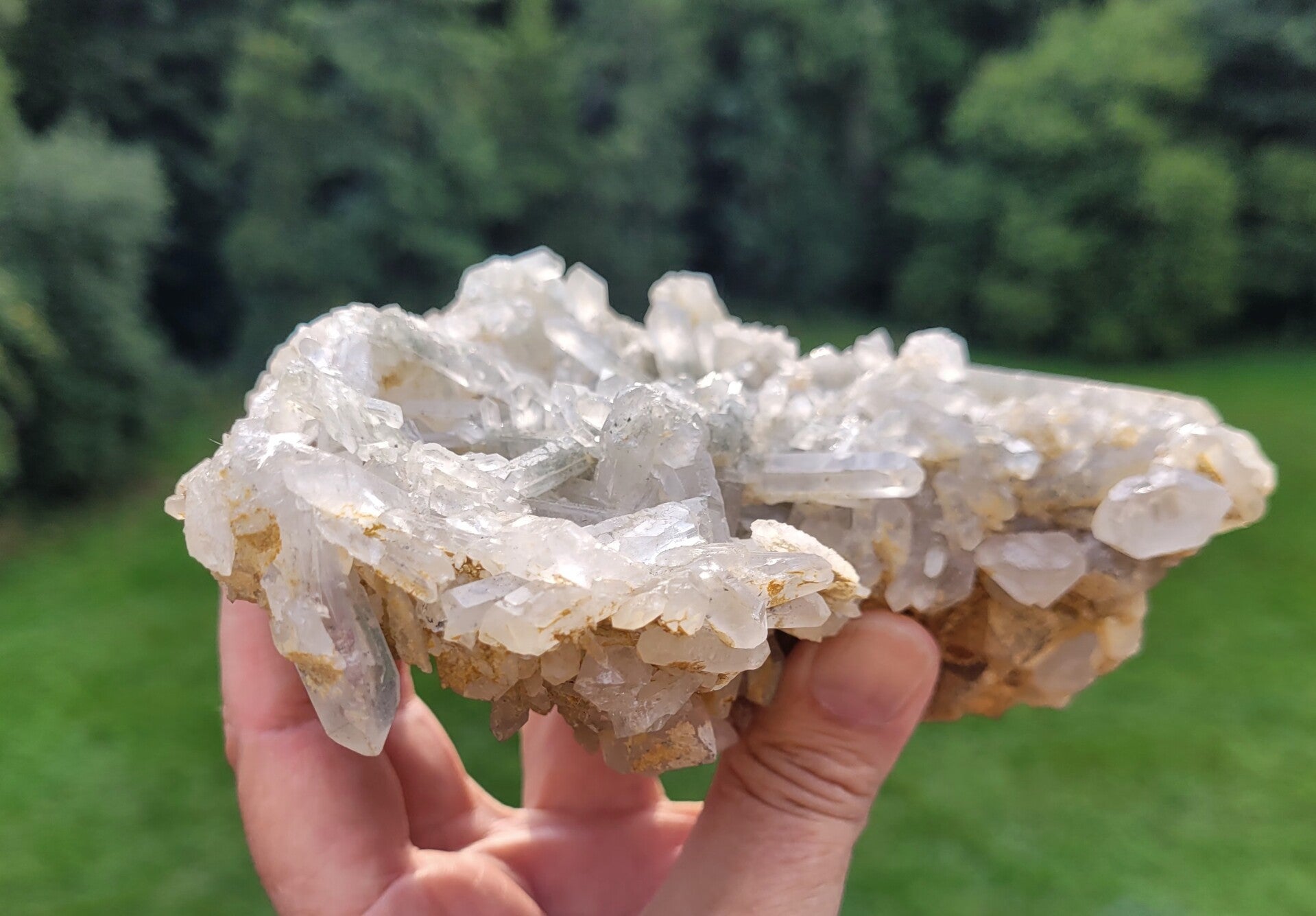 Stufe feine Bergkristall mit Chlorit, und gelb an untenseite ( limonit?) Kristalle rundum.