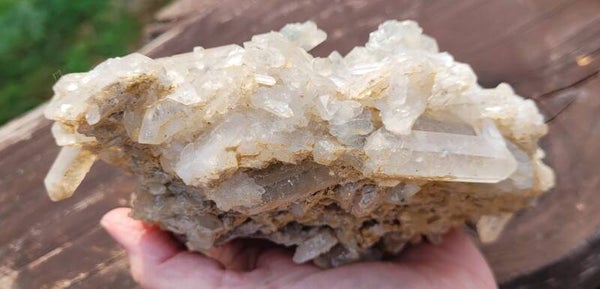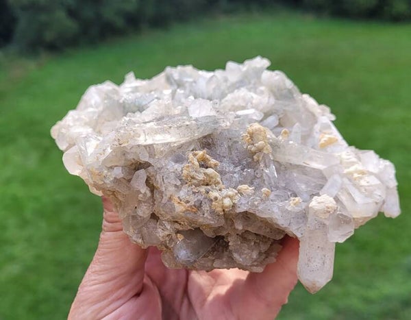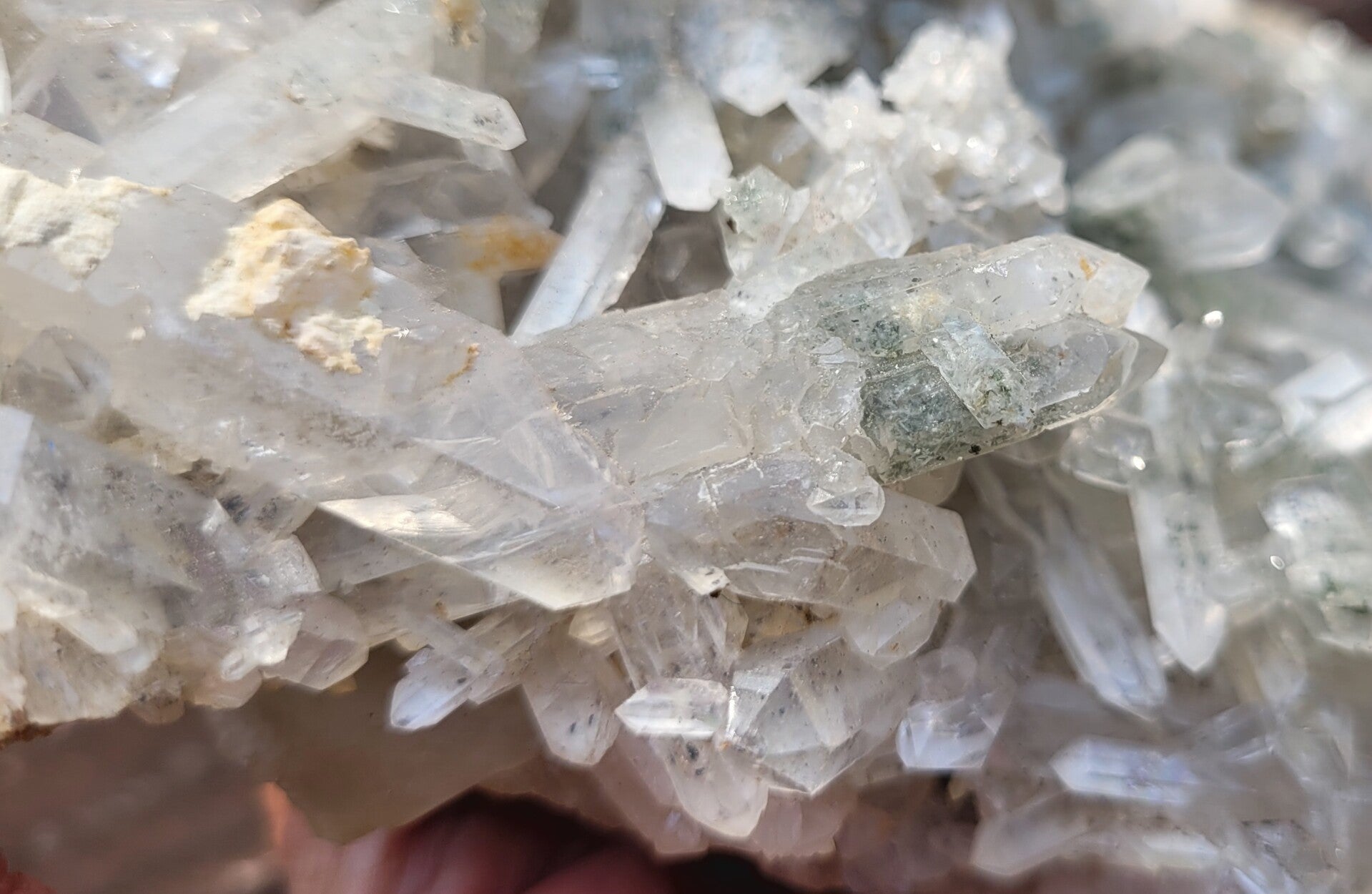 Quartz cluster with Chlorite crystals on top, and yellow at the other side. (Limonite mud?)