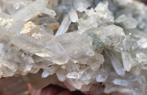 Apart cluster fijn bergkristal met chloriet aan de bovenkant en onderkant geel, limoniet? Kristallen rondom.