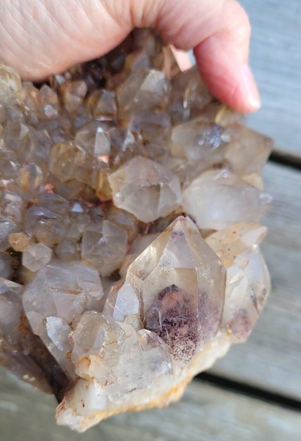 Mooi cluster Rookkwarts waarvan het grootste kristal een Hematiet insluitsel/ fantoom bevat.