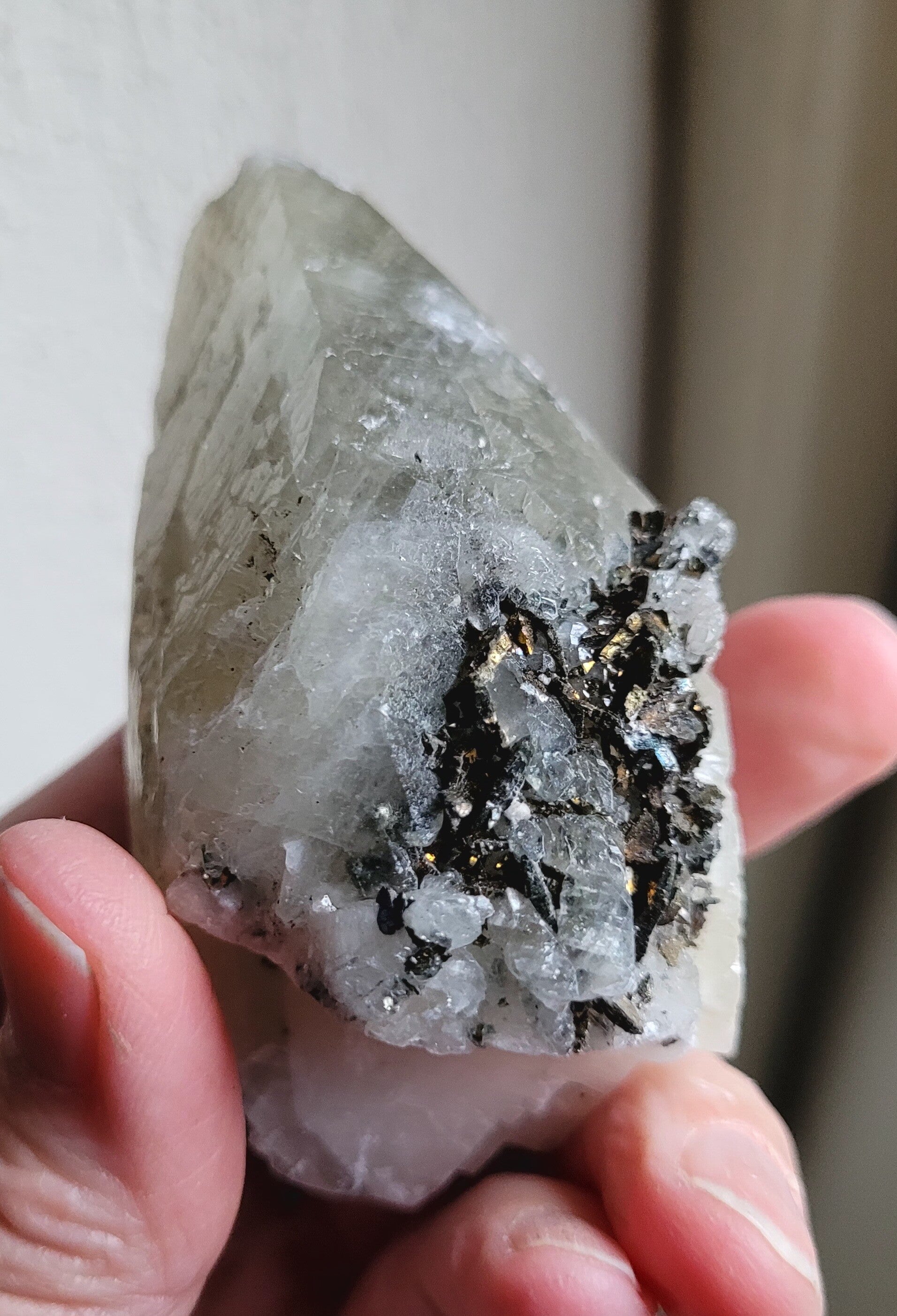 Large Calcite crystal wit Marcassite and Chalcopyrite. Point is damaged.
