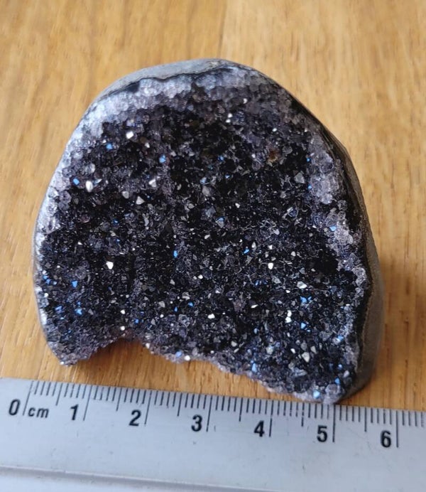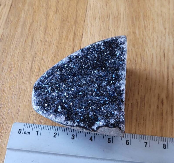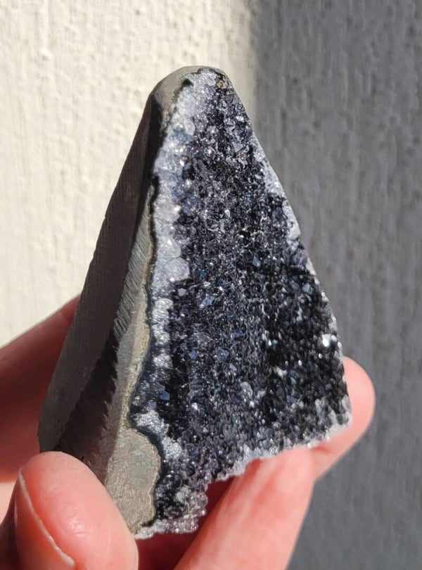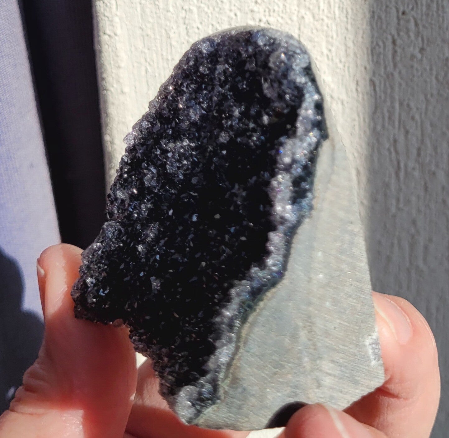 Letterlijk schitterende standup Zwarte Amethist. De donkerste vorm van Amethist. Standup is uitgezaagd uit moedergesteente met gepolijst randje.