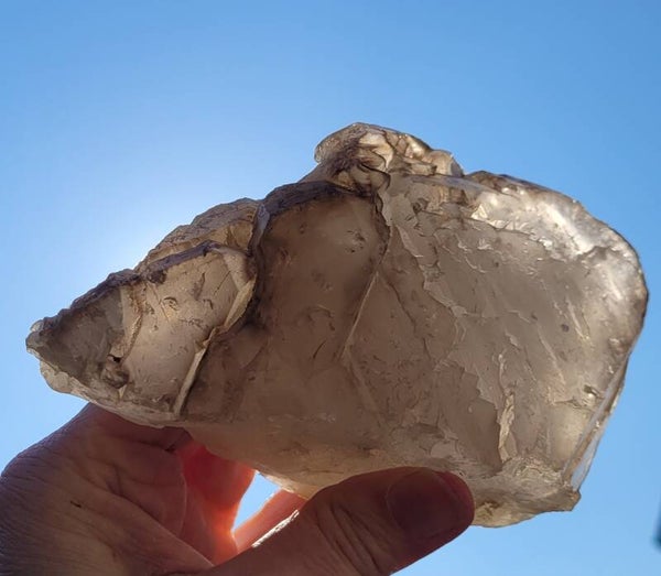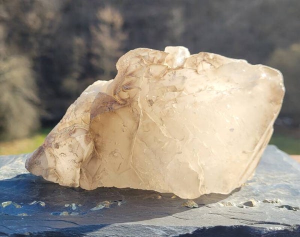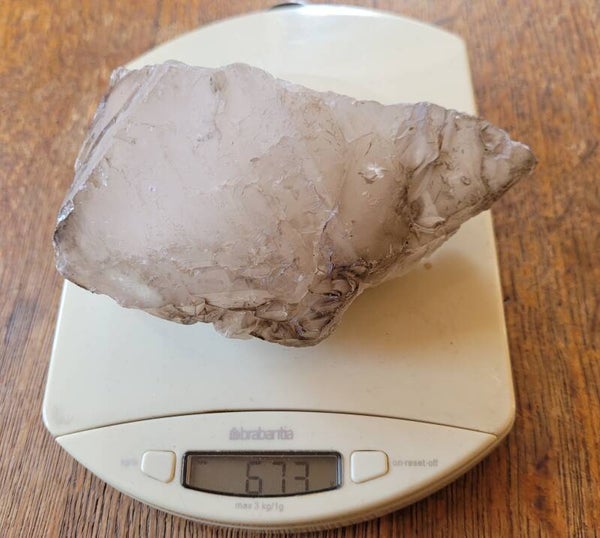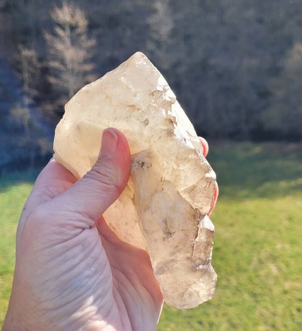 Mooie punt, mooie zijkanten. Achterkant en 1 zijkant waar hij op staat is niet uitgekristaliseerd, ruwe brok. Vandaar prijs.