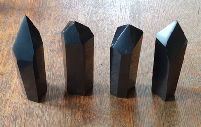 Sculptuur Shungite, met gepolijstte punt met meerdere vlakken, onderkant ruw.